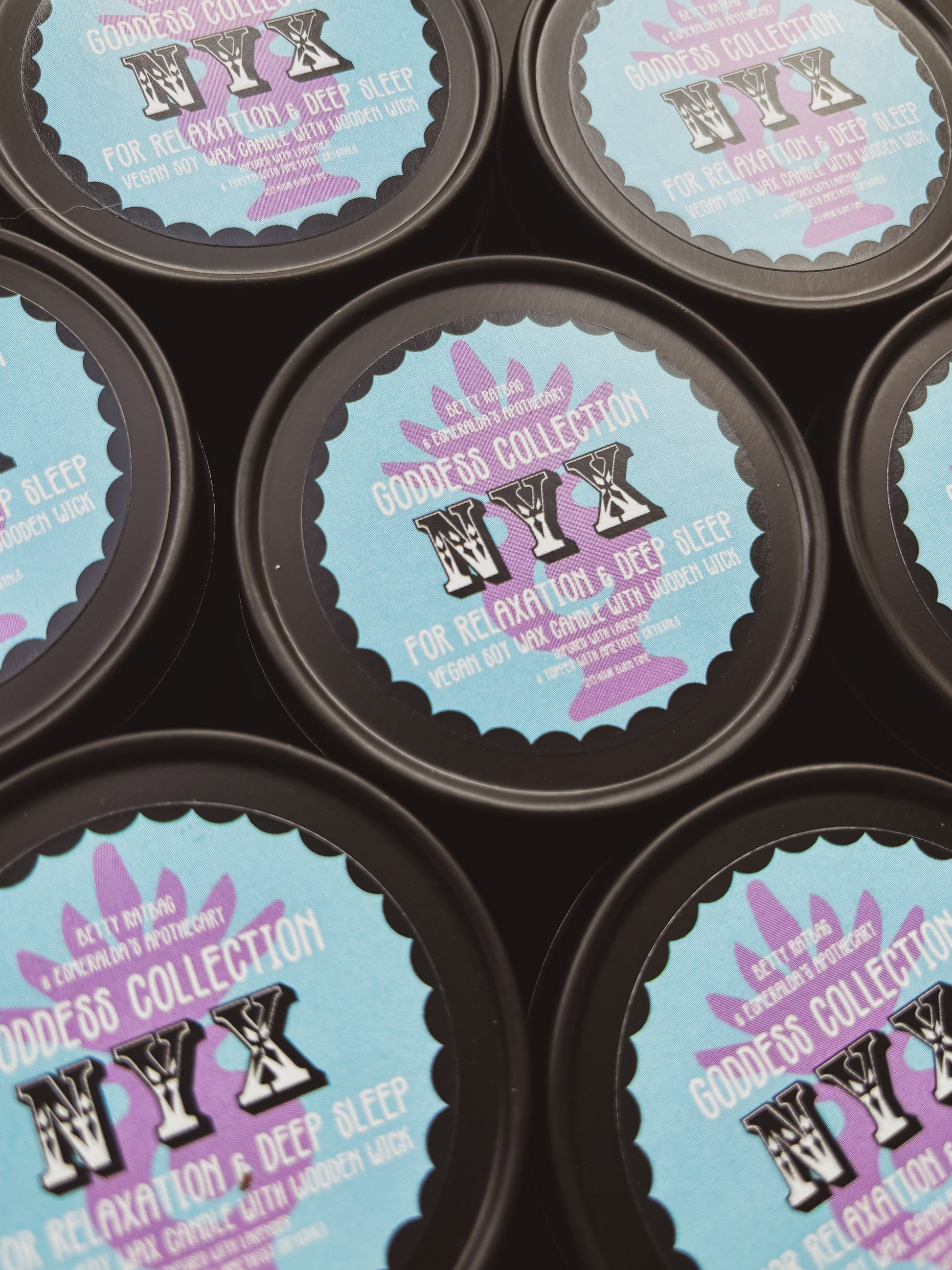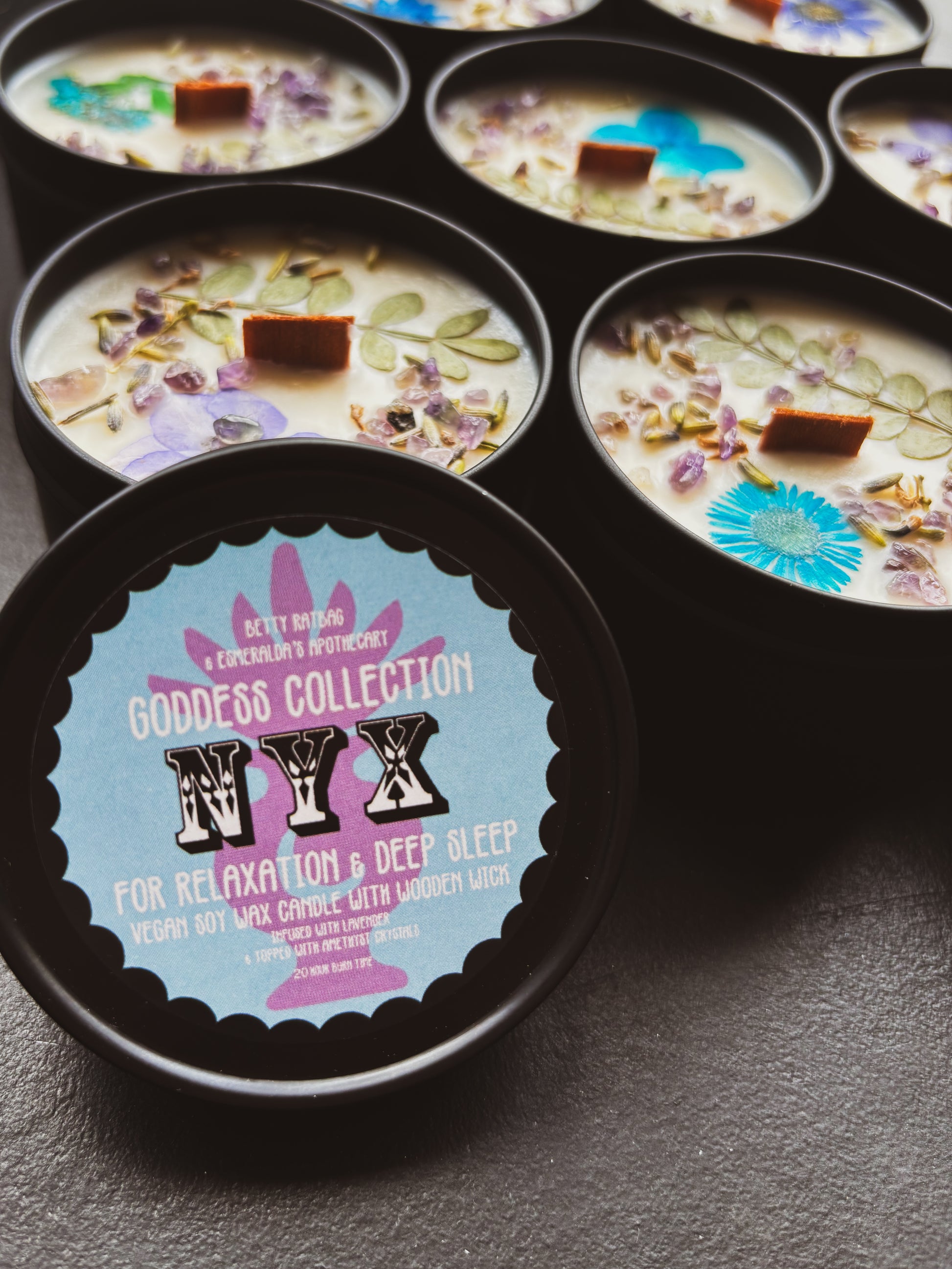 Nyx is decorated with an Amethyst crystal chips & dried lavender.